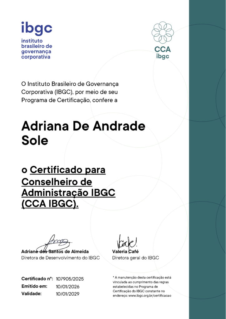 Conselheira de Administração desde 2010 e certificada pelo Instituto Brasileiro de Governança Corporativa (IBGC), Adriana reafirma, com esta recertificação, seu compromisso com a excelência técnica, a atualização contínua e a adoção das melhores práticas de governança corporativa no Brasil.