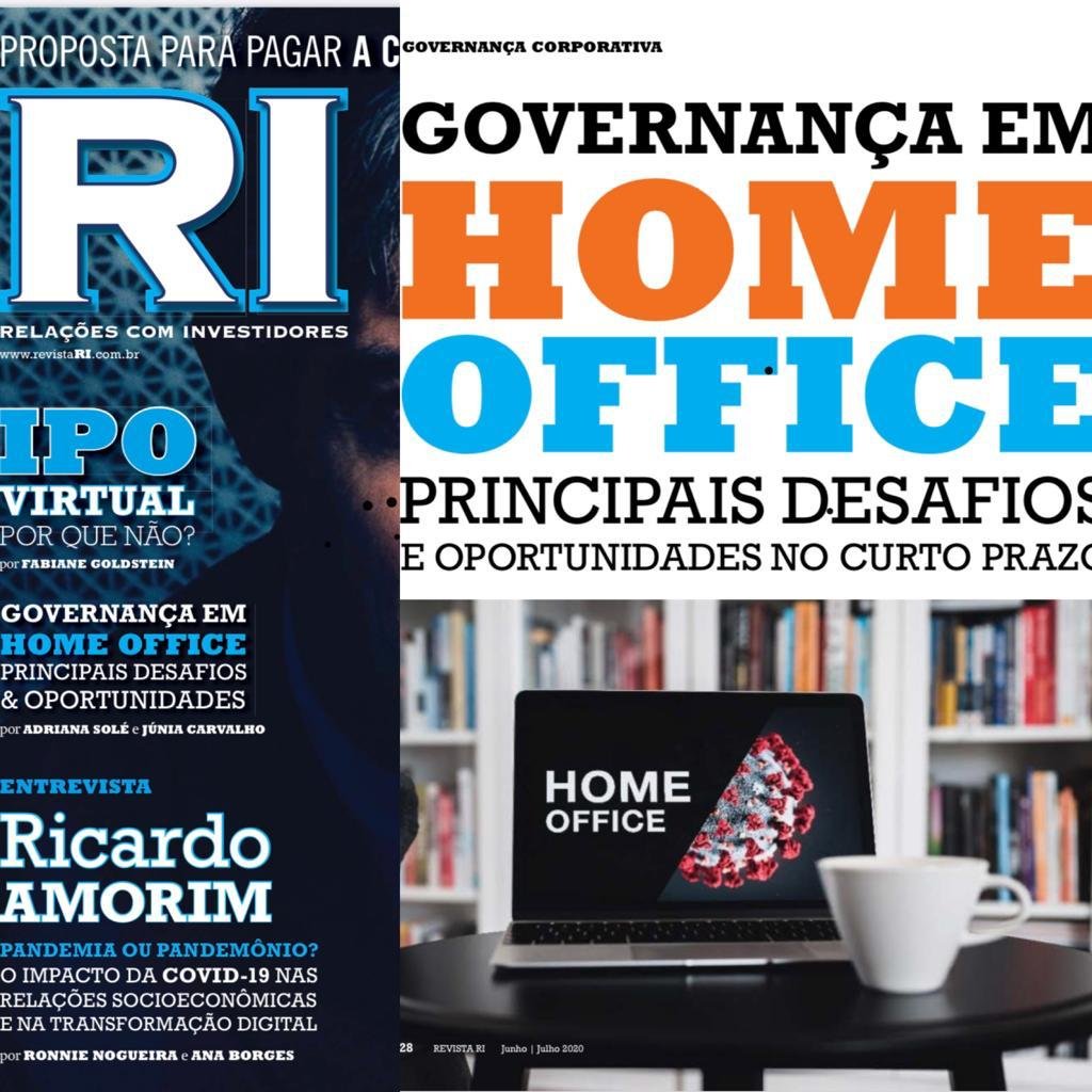 Artigo veiculado na edição 242, de junho de 2020 da Revista RI Relações com Investidores , no qual Junia Carvalho e eu abordamos os principais desafios percebidos até agora com o trabalho em Home office. A estratégia do artigo segue o racional dos 8 P s da Governança Corporativa desenvolvido por Rossetti e eu e descrito no nosso livro: Governança Corporativa: Fundamentos, Desenvolvimento e Tendências página 144 , sétima edição.