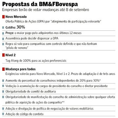 No Novo Mercado, caso 35 votos rejeitem a sugestão da bolsa, não haverá mudança do item negado. Entre os itens mais rejeitados está a oferta obrigatória a todos os acionistas quando um investidor alcançar 30% de participação em uma empresa. Essa regra é inspirada no modelo da diretiva existente na União Europeia.