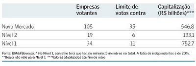 Segundo Valenti, até o momento, somente sete empresas do Novo Mercado enviaram seus votos à bolsa, além de duas listadas no Nível 2 e três, no Nível 1. Para o presidente do conselho de administração da BM&FBovespa, Armínio Fraga, esse tempo extra para a aprovação será importante para análise de temas que ainda não foram totalmente entendidos pelas empresas e que precisam ser avaliados adequadamente pelos conselhos de administração.